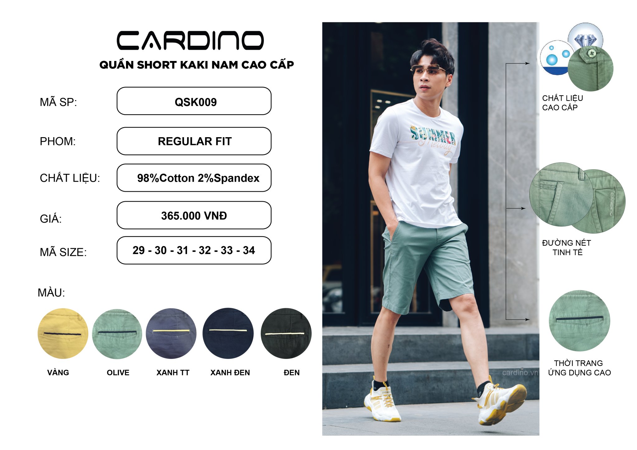 Những chiếc quần short là món đồ không thể thiếu trong tủ đồ của các chàng trai trong mùa hè nóng nực này. Quần short kaki QSK009 đang là mặt hàng cực hot trên website của Cardino Việt Nam nhờ tính thời trang và ứng dụng cao,mát mẻ, tiện dụng, giá cả phù hợp với chất lượng.